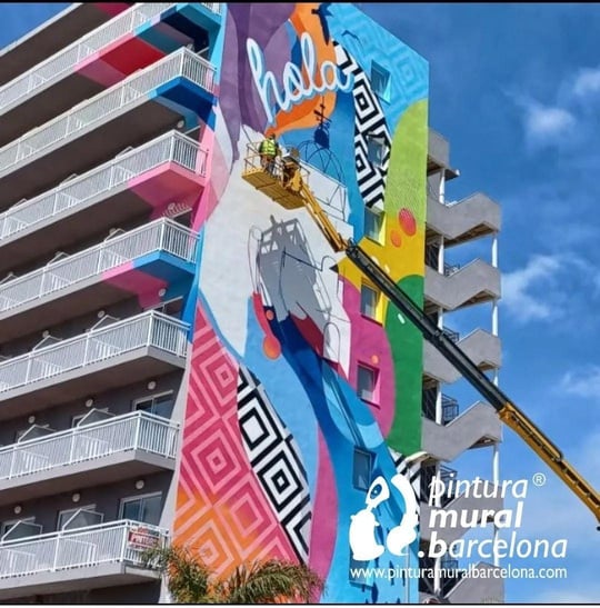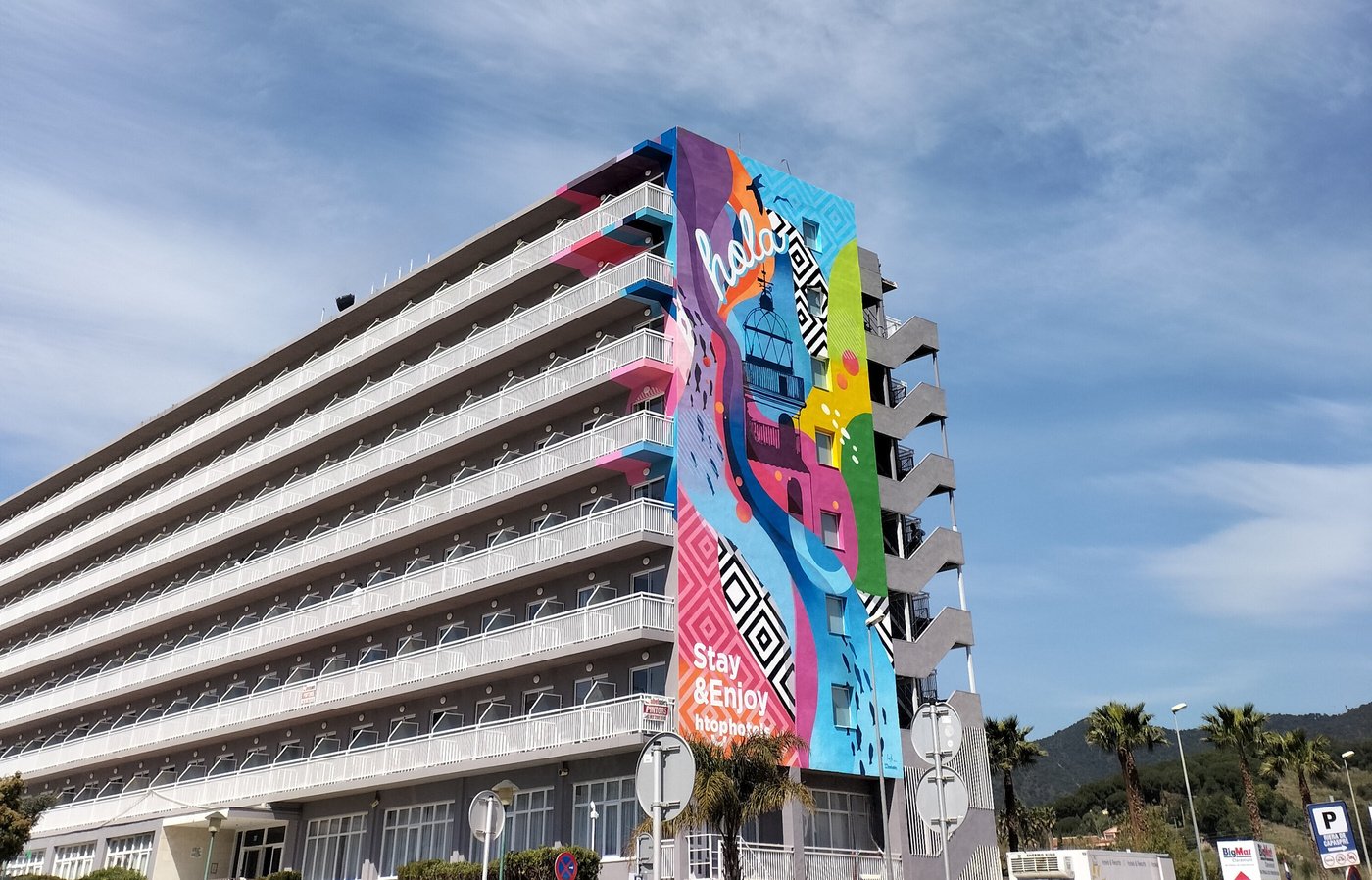 Mural for the facade of a hotel located on the coast of Barcelona (Calella). The message we seek to convey is HAPPINESS INCLUDED, in its Stay & Enjoy segment.